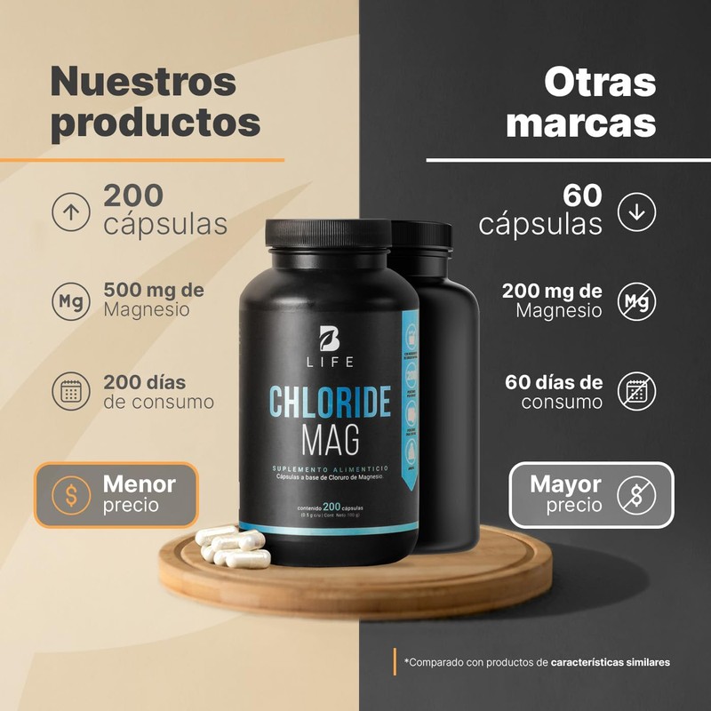 - ¡Alcanza tu bienestar pleno con Chloride Mag B Life! Cada cápsula de nuestra fórmula exclusiva ofrece una concentración máxima de 500 mg de Cloruro de Magnesio, superando a otras opciones que proveen únicamente 350 mg. Nuestra fórmula se distingue por la alta biodisponibilidad de este activo, facilitando una absorción óptima por parte del organismo. Contiene 200 cápsulas.