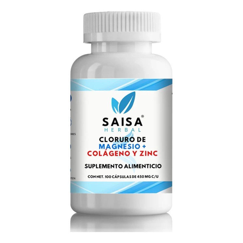 Cloruro De Magnesio + Colágeno Y Zinc | 100 Cápsulas | Suplemento Alimenticio Sin sabor | Saisa Hebral | Huesos y musculos fuertes, cuidado de piel