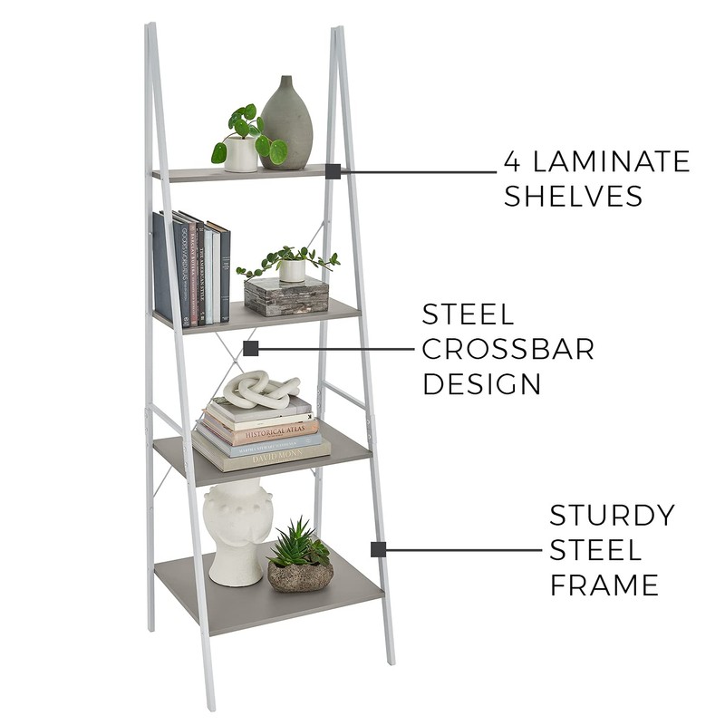• DECORATIVE LADDER SHELF: Trendy mixed material design features metal base and laminate wood shelves in ladder style design