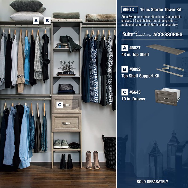 - SUITESYMPHONY COLLECTION: Add on drawers, additional rods, top shelves or other compatible units to create a custom closet (sold separately)