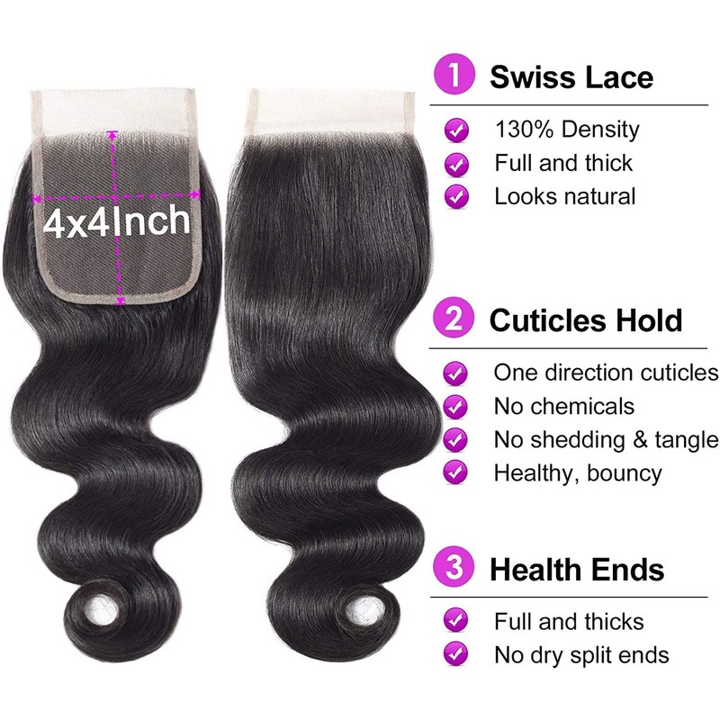 - Closure human hair quality: no chemicals, no shedding, no tangling, natural hairline with baby hair, slightly bleached knots. Full 130% density, gives you a very natural look