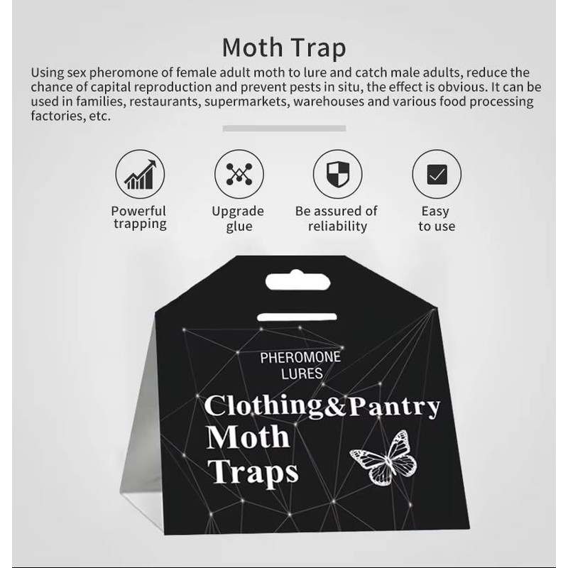 - ATTRACTS COMMON CLOTHES MOTHES USING NATUAL PHEROMONES – Specifically designed to attract and monitor the common clothes moth (Tineola bisselliella) by luring adult males using a pheromone-infused glue board, helping you detect infestations early.