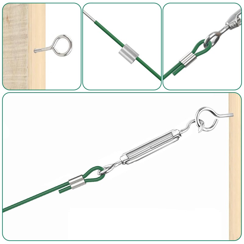 - ใ๐๐ฎ๐ซ๐ง๐๐ฎ๐๐ค๐ฅ๐๐ฌ ๐๐จ๐ซ ๐๐๐๐ฅ๐๐ฌ ๐๐ข๐ซ๐ ๐๐ข๐ญใFuuner garden steel wire kit contains: 6 M5 turnbuckle wire tensioners, 100FT PVC 8Ga coated green steel wire rope, 20 aluminum sleeves and 12 eye screws