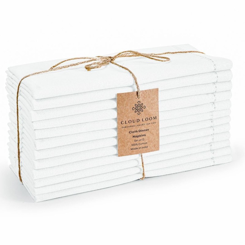 CLOUDLOOM Set of 12 Hemstitch Dinner Napkins 100% Cotton - Soft Durable Reusable Table Napkins - Perfect for Dining Weddings Parties Holidays Easter and Everyday Use - Cloth Napkins 18x18 Inch White