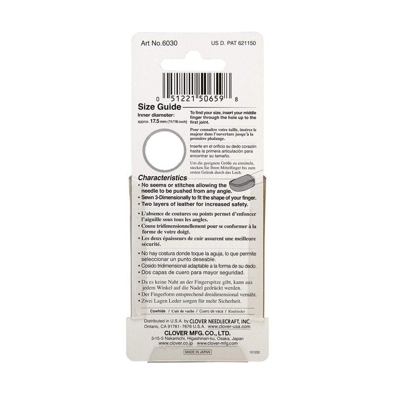 A new shape created to give you a perfect fit. A finger-shaped leather thimble from 3-dimensional stitching technology. No seams or stitches where the needle hits the thimble allowing the needle to be pushed from the most convenient spot. The unique shape creates a smooth curve from the edge of the fingertip to the middle of the finger for a cozy natural fit. Available in three sizes: each sold separately. Imported.