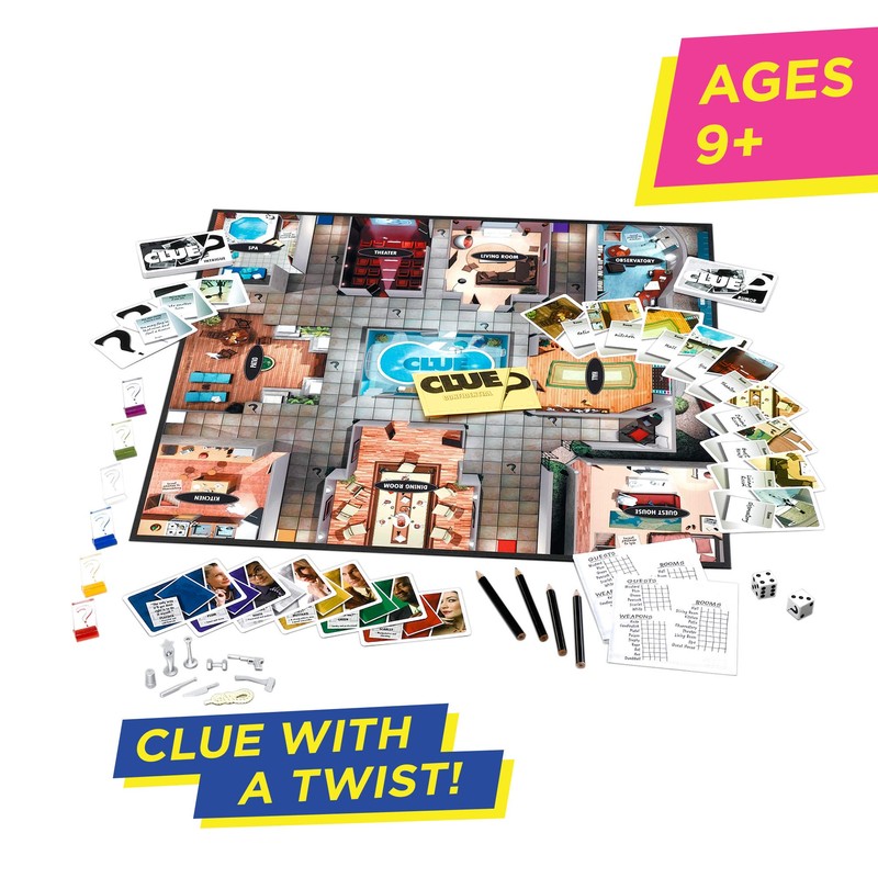 The mystery you love to solve again and again is even more intense! Clue is back with a modern twist: a soiree at a millionaire mogul's mansion turned deadly, and you must find out who is responsible for murdering the host. There's no Revolver or Billiard Room this time… but could it have been Scarlet with the Barbell in the Spa? Open up the tabloid-style instructions to get the scoop on the updated rooms, weapons, and guests. A deck of Intrigue Cards adds suspense to your game with cards that can help you solve the crime faster… or result in a second victim! Narrow down which rumors are true and which are just hearsay-and get caught up in the scandal of the century!