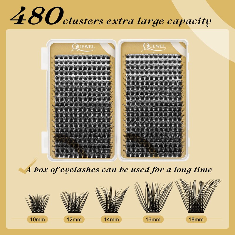 - 🌺【Specification】QUEWEL new upgrated individual cluster lashes,10-18mm mixed individual cluster lashes 20 rows 480 pcs, mixed details: 10mm*2 line, 12mm*4 line, 14mm*4 line, 16mm*5 line, 18mm*5 line.