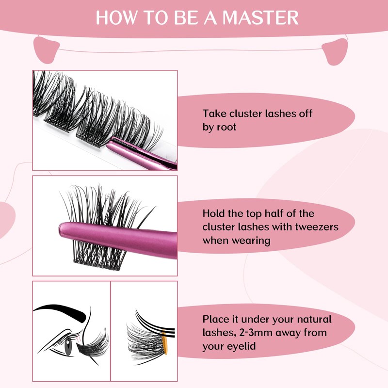 - How to Use: Apply the mascara wand cluster lash glue to your natural lashes and wait about 30 seconds.Gently take lashes off the strip by grab them at the root. Then apply the cluster lashes underneath your natural eyelashes, away 2-3mm from your eyelid! Finally, star your new day with your new eyelash!