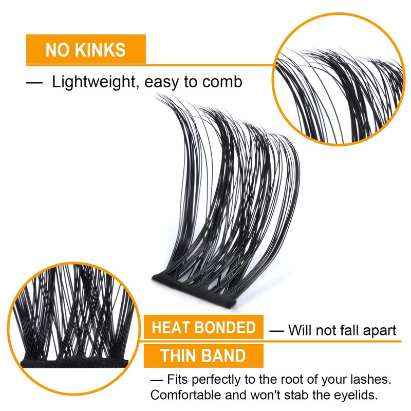 - SUITABLE TO WEAR: Use a tweezer to pinch the band of cluster eyelash extensions and apply lash clusters below your natural lashes. You can barely feel the cluster lashes. The bottom of the clusters is flat and hardly noticeable. The cluster lashes mixed length band part will not stab your eyelid area when you blink. Bring you a perfect experience during lash application.