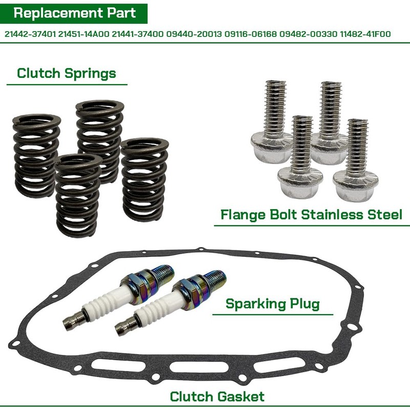 - 🏍️【Package Include】Clutch Plates x 7; Clutch Springs x 4; Clutch Gasket x 1; Clutch Steel Plates x 6; Sparking Plug x 2; Flange Bolt Stainless Steel x 4