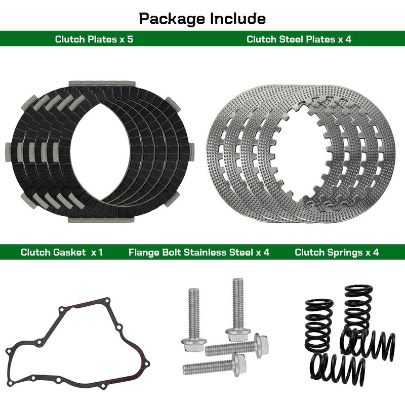 - 🏍️【Package Include】Clutch Plates x 5; Clutch Springs x 4; Clutch Gasket x 1; Clutch Steel Plates x 4; Flange Bolt Stainless Steel x 4; this kit ensures smoother gear transitions and a more responsive riding experience, extending the life of your motorcycle's engine;