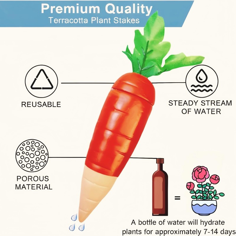 - Cute carrot shape: This plant terracotta watering stake is designed in a round and full carrot shape, with a few three-dimensional green leaves on the top, which instantly brightens the cuteness of the potted plants, full of natural childlike fun, making your plants more vibrant. It is not only a practical irrigation tool, but also a gardening ornament for windowsills and desktops