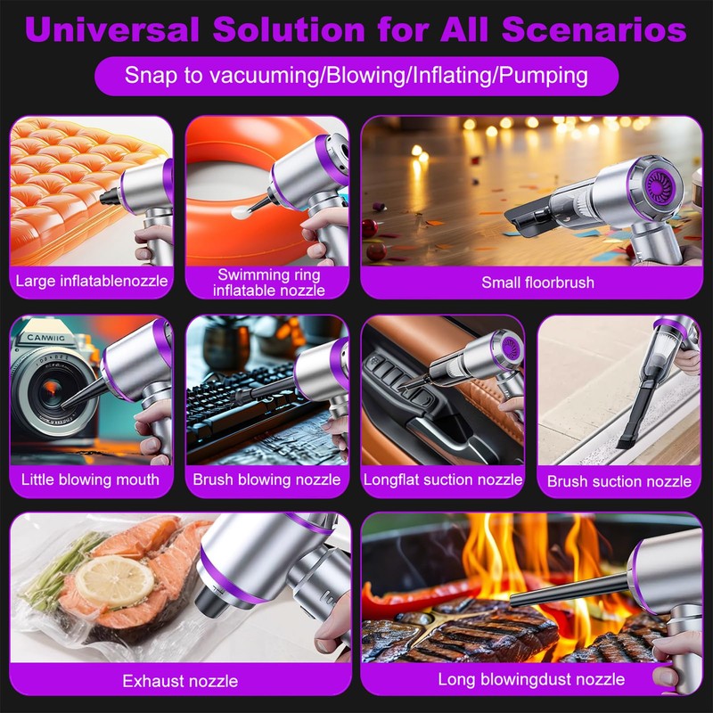 - 【3-In-1 Design】It is not only a mini car vacuum, but also an electric air duster and compressed air can. Buying three different nozzles and mini brushes at once can save you a lot of money.