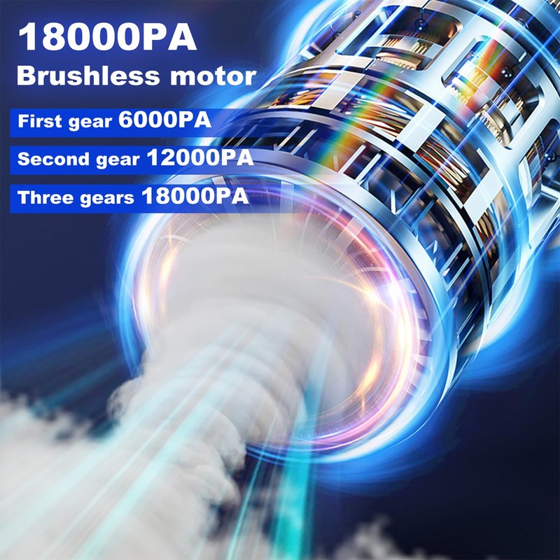 - 【Smaller Size, Stronger Suction】 This car vacuum cleaner high power has a length of 8.2in, weight of 0.8lb, but its brushless motor has 100W high power and can provide 18000pa suction, can capable of 80000 rpm. It has 3 modes, long press for 3 seconds to start.(Click the button, 9000PA can be switched to 12000PA and 18000PA. Fully charged before first use)