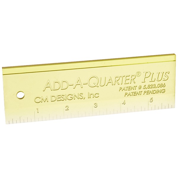 Cut swiftly and precisely with this CM Designs Add-a-Quarter Plus ruler. This ruler lets you cut several layers for efficiency and instantly adds a seam allowance to straight angles. Features: 6 inches long