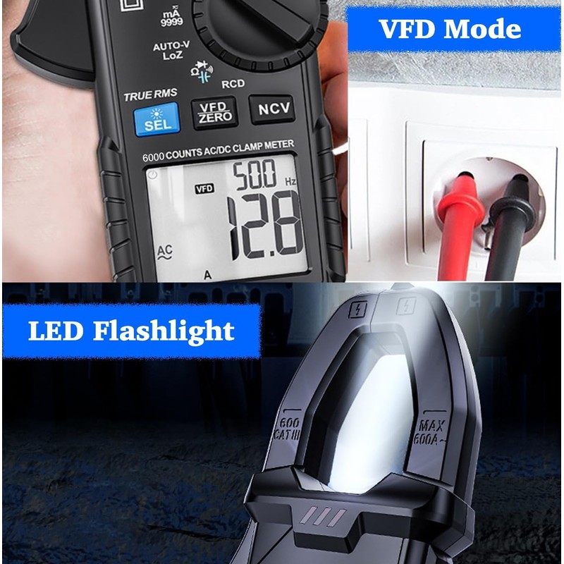 - NVC & VFD: Clamp meter features NCV function for detecting AC voltage without physical contact; VFD mode for measuring AC current accurately under specific conditions