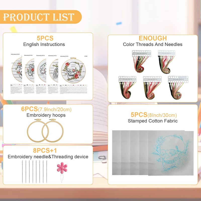 - What's included in the kit: Our cross stitch kits includes 5 pieces of exquisite patterns corresponding to the theme, 2 embroidery hoops, several needles, 1 needle threader, and enough thread. Maybe you can relax in a different way and enjoy some arts and crafts over the weekend. You can complete fun artwork with your kids or friends
