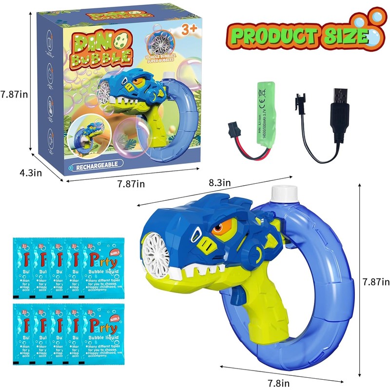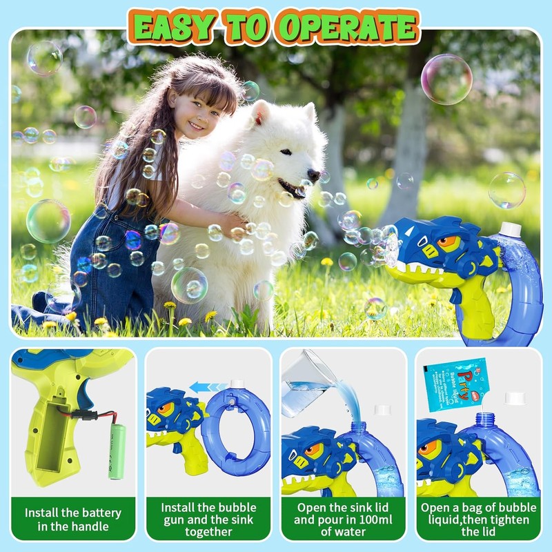 - 10 Refill Packs, Rechargeable Convenience: The dinosaur bubble machine for children aged 3-5, comes with ten refill packs, allowing kids to enjoy long playtime in the bubble world. Say goodbye to the hassle of constantly replacing batteries. The included rechargeable battery ensures kids can keep the bubble fun going without interruption