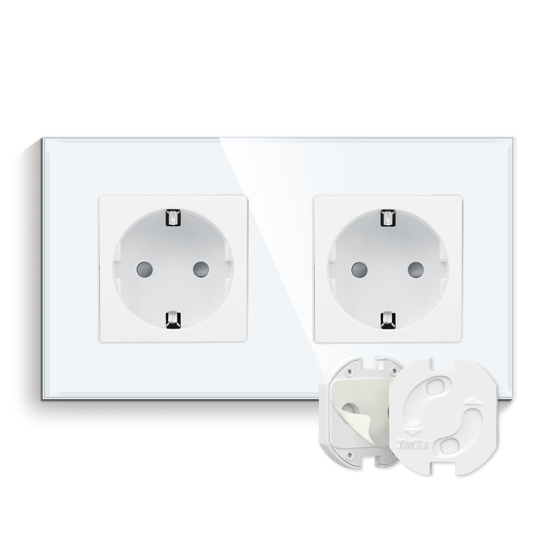 CNBINGO Glass Double Socket Flush-Mounted in White - Socket Protection Child Lock with Twist Mechanism - Double Schuko Socket - Protective Contact Wall Socket with Glass Frame