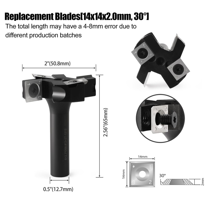 - 【 2+2 inserts CNC Router Bit 】Shank: 1/2"; Cut Diameter: 2" ; 2+2 inserts design, resulting in a more balanced tool while running and get a smoother surface. Comes with Extra 10 Replacement Blades(14x14x2.0mm,) for your usage.