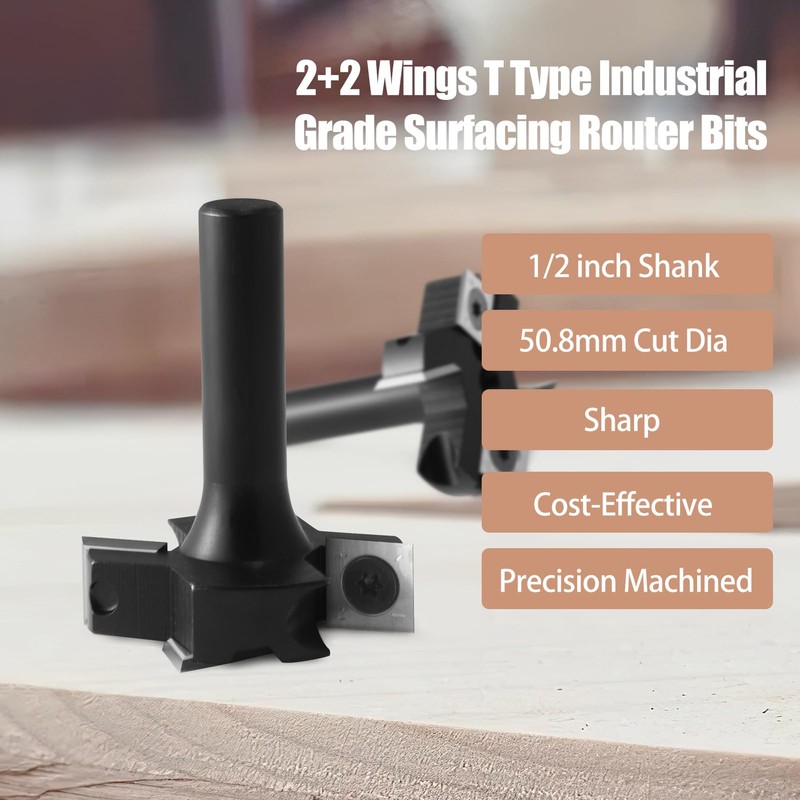 - 【 Sturdy Durable Design】This slab flattening router bit uses premium C2 carbide inserts that are sharper and more durable, the body is made of tungsten steel, 2+2 Insert Knife design provide you sharpe edges and ideal chip evacuation.