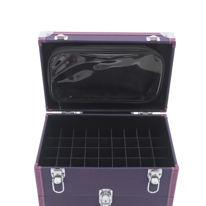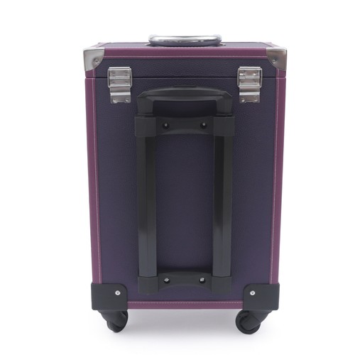 Makeup Train Case, Rolling Makeup Trolley Case, Nail Polish Organizer w/ 4 Wheels, Purple   Description A traditional makeup bag may no longer be able to handle your large amount of makeup. You don't need to worry about that because we have this makeup train case to meet your storage needs. Its vintage lychee pattern and large storage capacity give you a stylish and practical makeup train case. The excellent material makes it won't be easily damaged, thus providing you with storage for a long time. It will be your ideal choice for storing cosmetics and more.   Specification Material: PU+PVC+Zinc Alloy Color: Purple Maximum Length of Telescopic Rod: 45cm/17.8'' Number of Layers: 3 Shape: Cuboid Wheel Height: 7cm/2.8'' Lid Height: 5cm/2inch Upper Layer Size: 36*23*9cm/14.2*9*3.5