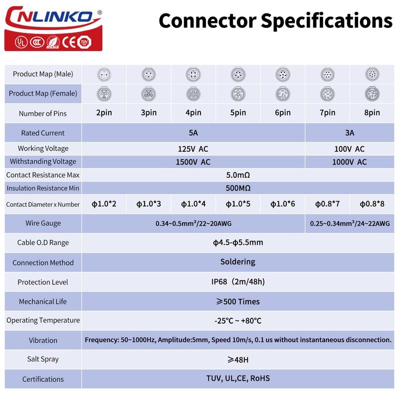 - Cable specifications: 0.34-0.5mm²/22-20AWG; Cable diameter range: φ4.5~F5.5mm; Contact diameter × Numéro: Φ1.0×5; Durability: ≥500 plug-in/disconnect cycles; Temperature range: -25℃~80℃; Mounting method: welding