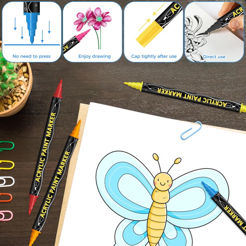 Acrylic pen with double nib: each acrylic marker has an ultra-fine nib and a brush nib that give you the freedom to create intricate details and smooth lines. The 1 mm fine nib is designed for detailed illustrations, while the variable nib from 0.5 to 5 mm makes it easy to cover large areas, which dramatically increases the flexibility and efficiency of your drawing. Whether you are looking for precise lines or expressive strokes, these markers are perfect for your creative needs.