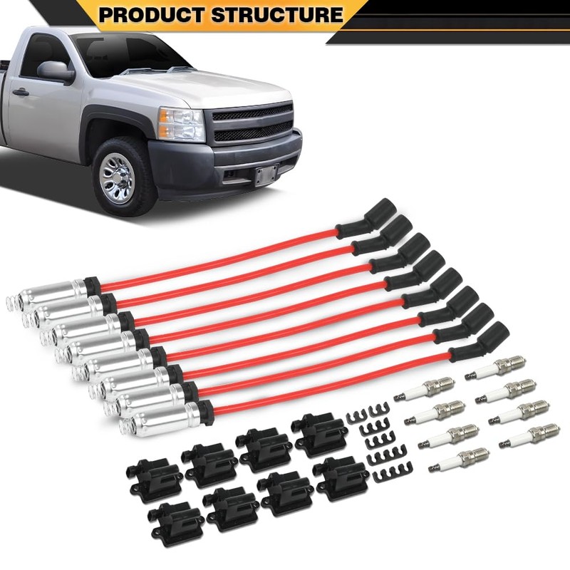 CNNELL 8 Pack Square Ignition Coil & Spark Plug Wire Compatible with Compatible with Chevy Express Silverado GMC Yukon Savana Sierra Hummer H2 1999-2007 41-962 M8-48322R UF-271