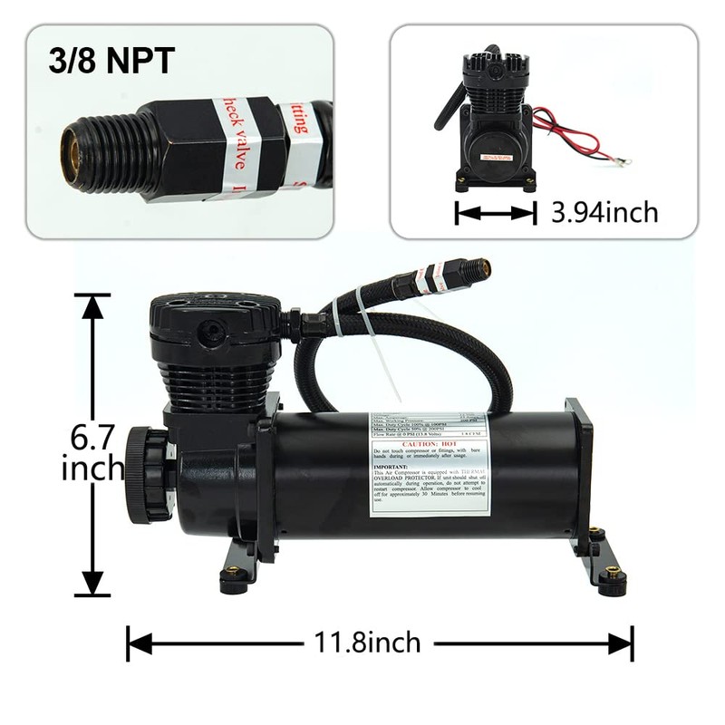 - 【Product Parameters】Power:12V,Max. Working Pressure: 200 PSI,Max. Amp Draw: 23 Amps,Flow Rate (0 PSI):1.7CFM,Dimensions:10-3/4" L x 4" W x 6-3/4" H.