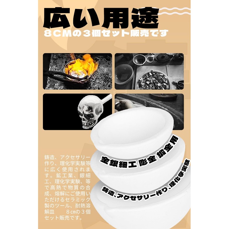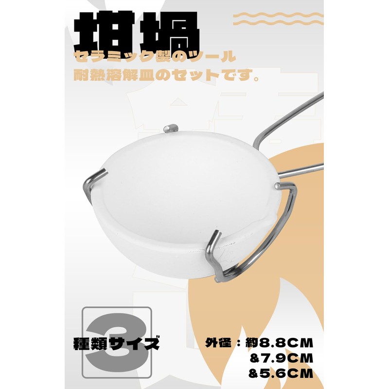 (Set Contents) 1 scissors + 3 stars. (Torto) Outer Diameter: Approx. 3.5 inches (8.8 cm), 3.1 inches (7.9 cm), 2.2 inches (5.6 cm), 1.4 inches (3.6 cm), 1.4 inches (20 cm); Heat resistant temperature: Approx. 2,800 degrees F (25 cm); Material: Stainless steel. It is used in a very wide range of chemical experiments such as chemical reactions that require high heat, metal melting point measurements, metal solution, purification and crystal synthesis. (Recommended Points) Length: Approx. 9.8 inches (25 cm) long with a special design for holding the trigger. Non-slip, hook-shaped, dimples on the end to protect your hands from burns when moving buckly. Pottery Pottery: Lightweight and easy to handle. However, it is heat resistant up to 2,800 degrees Celsius. In addition, the ceramic pottery is chemically stable from its material, making it suitable for heating and mixing special substances. Wide range of uses: It is widely used for casting, accessory, and scientific experiments. Please be careful not to drop or impact the ceramic starter.