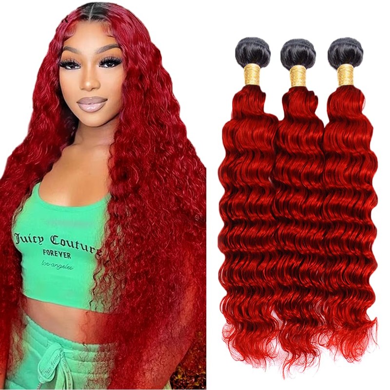 - 【💝Ombre Deep Wave Bundles Hair Color】: 1B/Red Bundles, Ombre Two Tone Bundles,Natural Black and Red Human Hair Bundles.