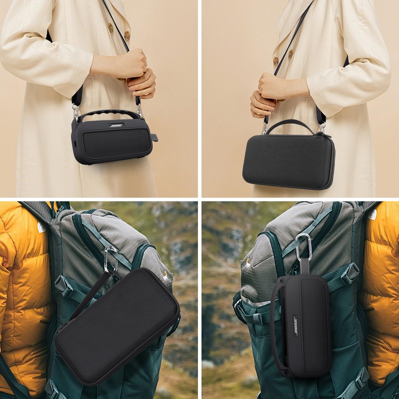 - This soundLink Flex speaker hard case and silicone case has an adjustable, high-quality strap that allows for crossbody or over-the-shoulder carrying, so you can simply hold the Bose sound link Flex gen 2 wherever you go and enjoy music anywhere. This Bose soundLink Flex bluetooth speaker gen 2 case has a sturdy aluminum carabiner allows you to securely attach the speaker to your backpack, belt loop, or other gear, keeping it easily accessible during hikes, bike rides, or picnics.