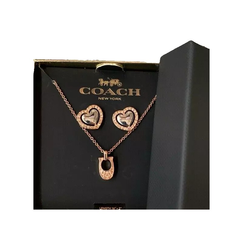COACH 3-PC SET C Logo Rose Gold Necklace & Heart Earrings Crystal Pave +GIFT BOX