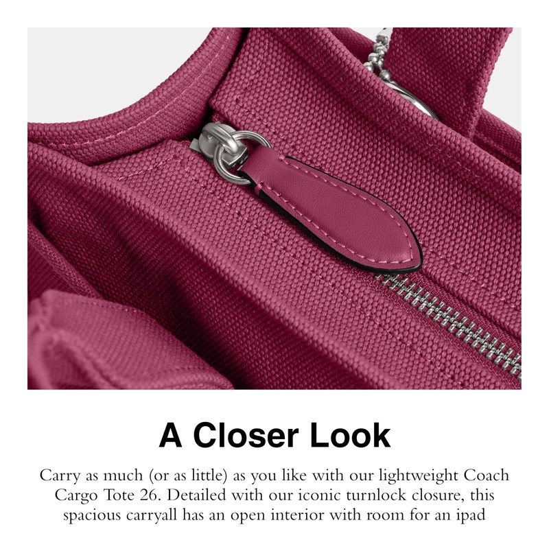 - Editor's Notes: Carry as much (or as little) as you like with our lightweight Coach Cargo Tote 26. Detailed with our iconic turnlock closure, this spacious carryall has an open interior with room for an ipad