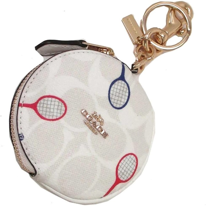 This Coach round zip pouch is a stylish accessory for women who want to keep their coins and keys organized. The pouch features a chalk/multi racquet print theme that is perfect for tennis enthusiasts. The material used is a combination of signature coated canvas and smooth leather, providing durability and style. The zip-around style ensures that your belongings are secure, while the split key ring and dog leash clip make it easy to attach to your bag or keys. The pouch also features red and blue racquets accents, adding a touch of color to the design.
