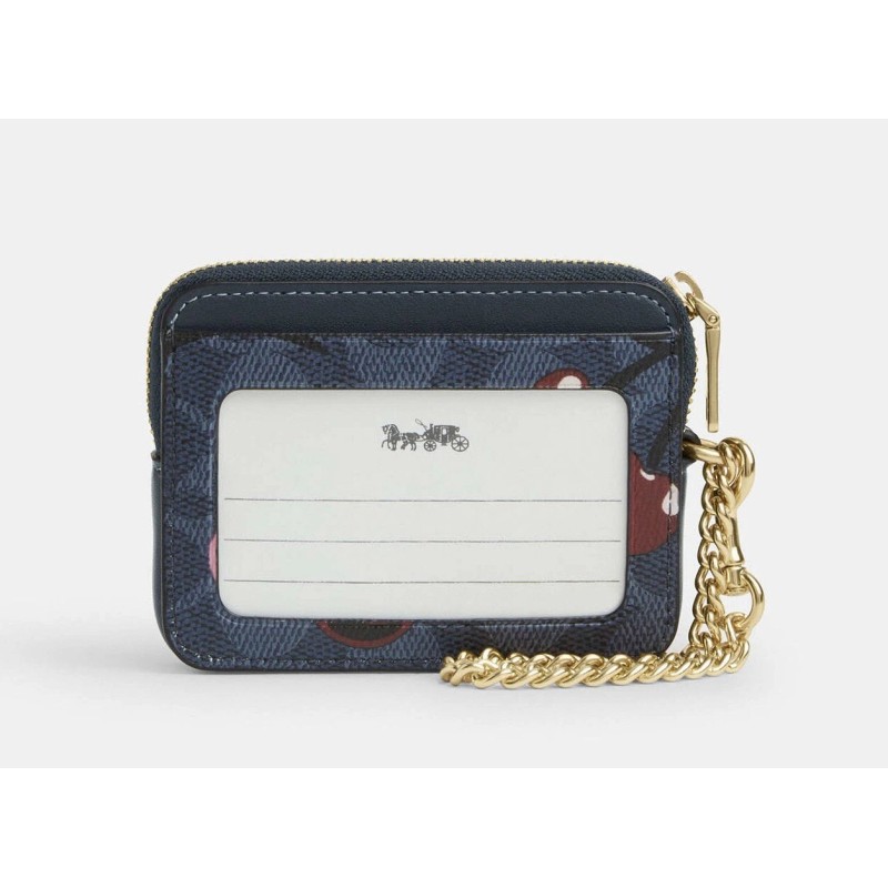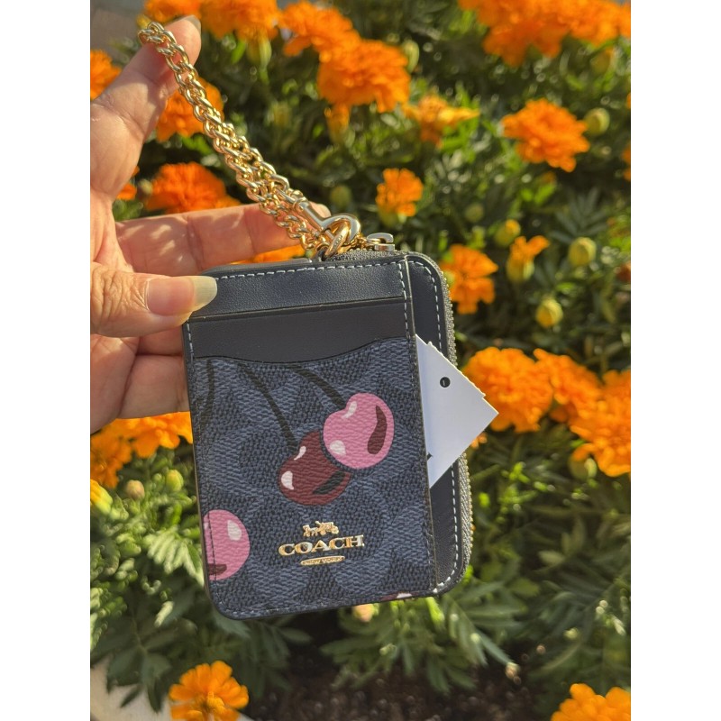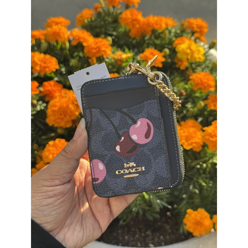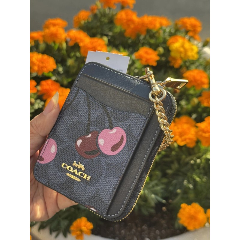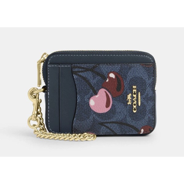 Coach CZ468 Zip Card Case Signature Cherry Mini Wallet Denim Multi