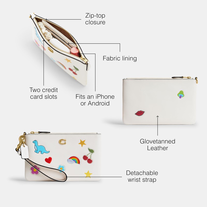 - Editor's Notes: Crafted of sticker print glovetanned leather and detailed with our Signature hardware, this Coach wristlet is perfectly sized for cards, cash and a phone