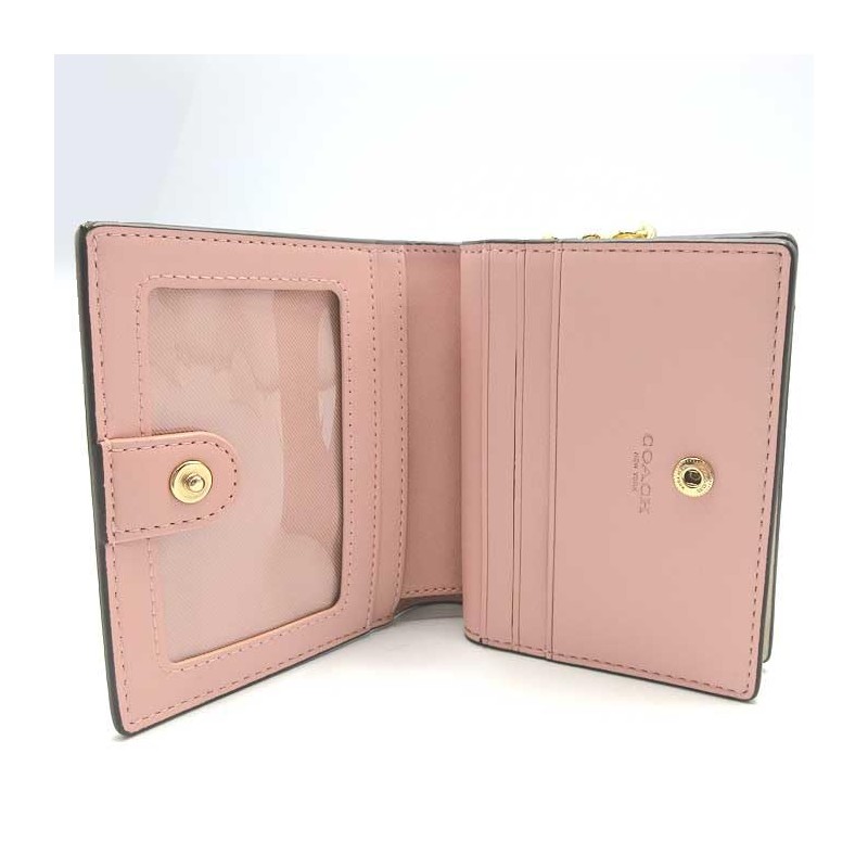 2025 Spring/Summer Model; 2025SS; Coach Bi-Fold Wallet. A stylish bi-fold wallet with a floral print (floral pattern) on a beige signature all-over PVC design. Zip around with hook and eye closure featuring card pockets, pass case, and back coin purse with C logo charm. This lightweight and compact mini wallet is also recommended as a gift.
