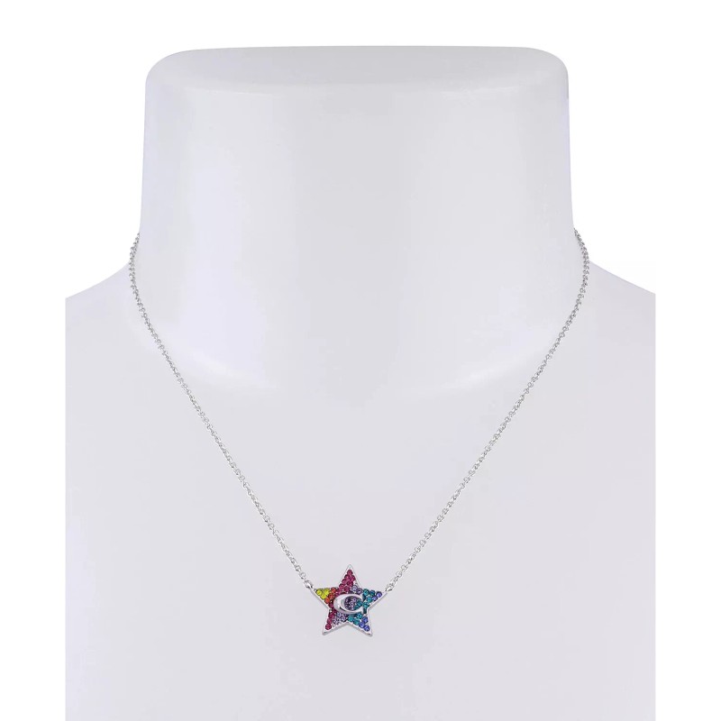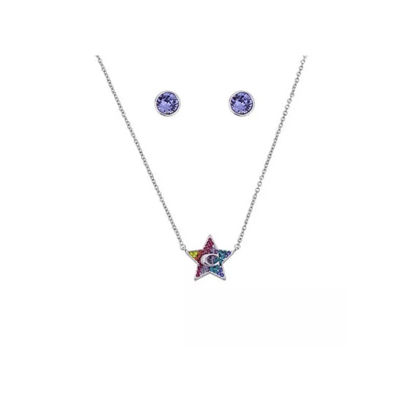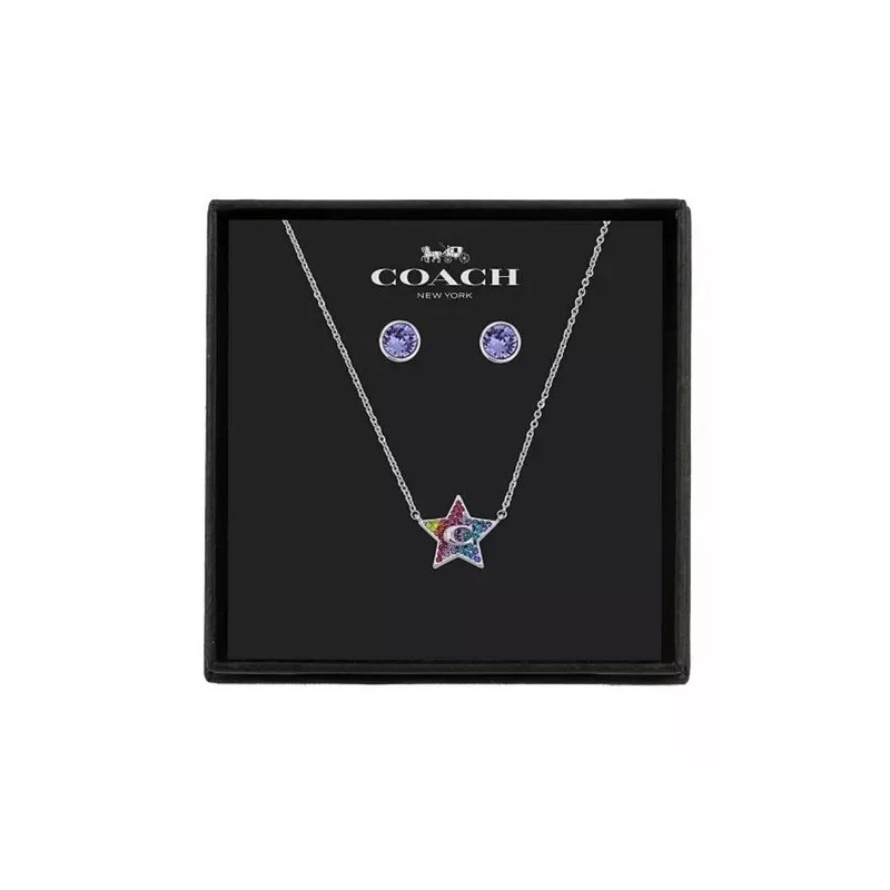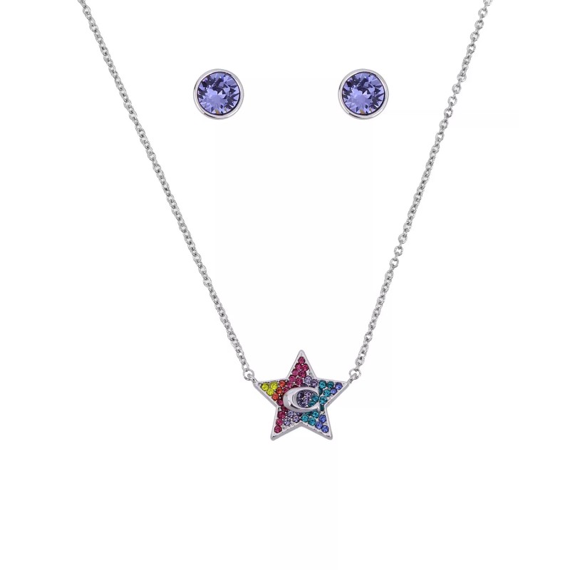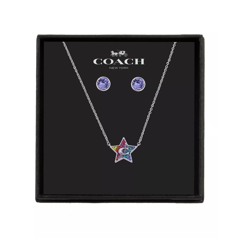 COACH Logo 3-PC SET Red Blue Crystals Pave Silver Stainless Steel Necklace & Stud Earrings