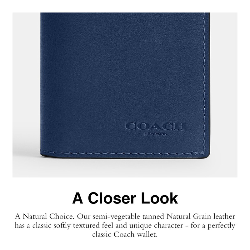 • Natural Grain Leather: A Natural Choice. Our semi-vegetable tanned Natural Grain Leather has a classic softly textured feel and unique character - for a perfectly classic Coach wallet