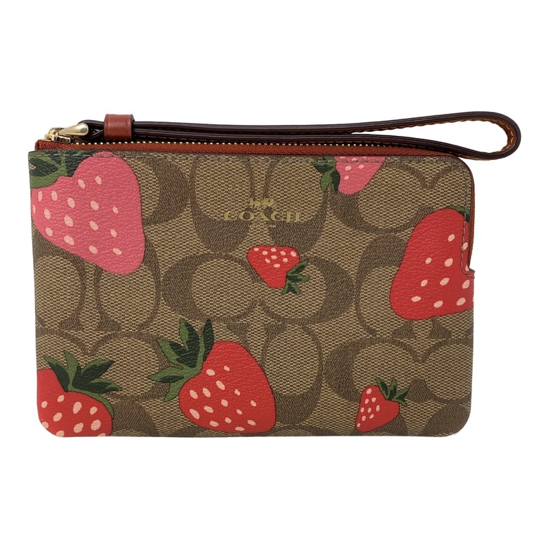 Coach Signature Corner Zip Wristlet with Strawberry Print Khaki Style No. CH166
