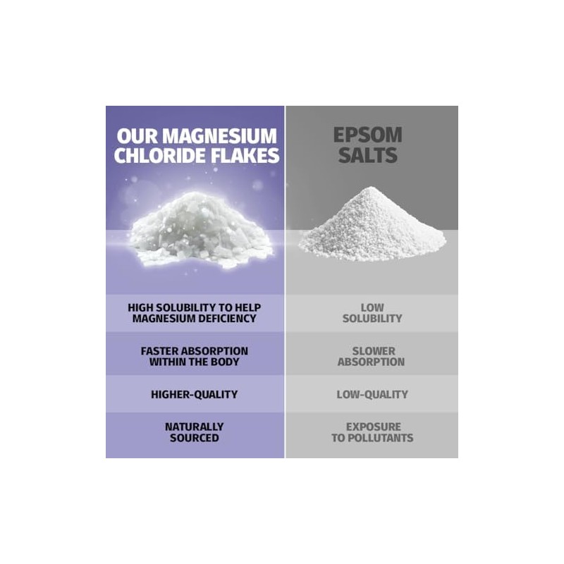 - Elevate your bath routine with Transdermal Magnesium Chloride flakes, surpassing Epsom salts in absorption. Tailored for feet or muscles, our pure bath salt blend aims to promote relaxation after a long day.