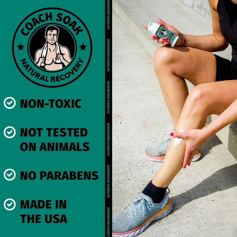 - Coach Soak's Magnesium Lotion, designed for athletes, offers quick absorption directly onto the skin. Experience the benefits of magnesium chloride with a menthol sensation. Same quality, new packaging! Your purchase includes a copy of our ebook "How Magnesium Aids Post-Workout Recovery".