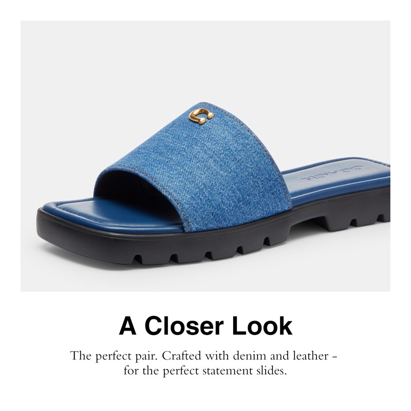 - Denim & Leather: The perfect pair. Crafted with denim and refined leather - for a the perfect statement slides for women