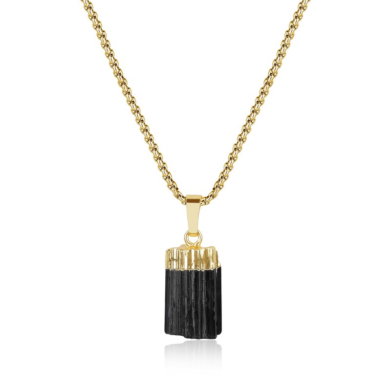 Beautiful genuine black tourmaline stone pendant strung on durable gold plated stainless steel chain.