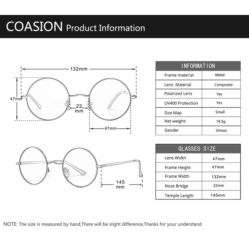- COASION Sercive after Sales --- It's our honor that you shop in COASION Store.If you have any dissatisfaction about our Round Sunglasses,please let us know at the first time by E-mail.We'll solve your problem within 24 hours,7 day free exchange or money-back.