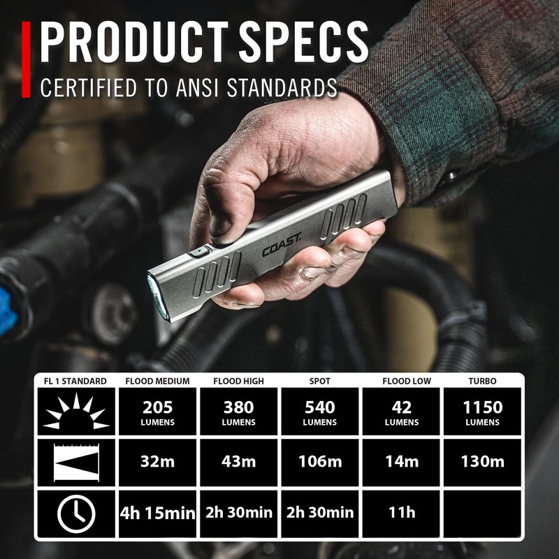 Wield bright light wherever you go. The rechargeable and waterproof SLAYER flashlight carries like it was meant to—and it was. The all-aluminum frame's flat rectangular shape slides easily in and out of pockets and secures in place with a removable metal clip when tucked away. Featuring a dual optic system, the flood and spot beams cycle through five modes—medium flood, high flood, spot, low flood and Turbo—with the simple click of a button. Set your favorite or go-to light mode using the COAST Memory Mode function—simply hold the rear switch down until the light flashes. Once set, Memory Mode allows you to jump straight to your beam selection when you press the rear switch. On lower power, this go-everywhere light can run up to 11 hours. And on Turbo, the SLAYER peaks at 1150 lumens with a beam length of 130 meters (426 feet). During use, the charge level indicator ensures you always know when you need to plug in—the integrated ZITHION rechargeable battery powers back up fast via the USB-C port, in just two hours. Constructed of top-grade materials and fit for the toughest work, the SLAYER is rated IP57 dust resistant and waterproof and backed by the COAST lifetime warranty.