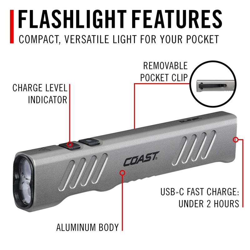 Coast Slayer 1150 Lumen USB-C Rechargeable LED Flashlight with Spot/Flood, Memory Mode and Pocket Clip, Silver