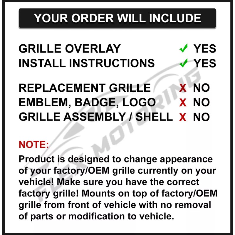 - Warning!: Only fits factory grille shown! Not replacement